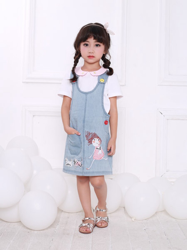 乖乖巧巧的小女孩,看一眼就让人爱到心坎里。夏季想要为宝贝来上一款背带裙?那么有什么好看的款式推荐的吗?这一款浅色系牛仔背带裙上面刺绣的设计显得更加精致,可爱的娃娃与小动物赢得小女孩的心哦。搭配一款白色娃娃领短袖更显甜美时尚,笑女孩穿更可爱哦。