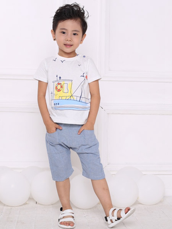 白色卡通T恤时尚又符合小男孩的心思,面料舒适柔软体验。手感好,给宝宝带来舒适的感受。搭配灰色五分裤是不是有着不一样的韵味呢?这样的时尚你一定要hold住哦。