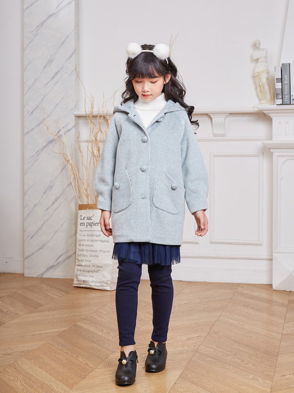 这款蓝色的格纹外套是不是很好看,而且带帽的设计很是俏皮可爱,版型都是很合身的,穿在身上舒适简约,纽扣的设计简约大方,内搭一件白色毛衣,衣领的设计很是保暖哦,下身搭配一件半身裙,将孩子的天真与浪漫展现出来,怕冷的话可以选择搭配一见黑色打底裤,搭配一双黑色小皮鞋,整体的造型休闲有很简约。