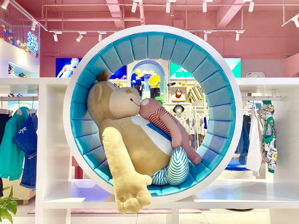 店铺形象方面,我们抛开了繁复线条,舍弃高饱和度的配色,新的形象采用极简图形和纯美的配色,这样更接近孩童简单纯真的本性。同时在店铺设计中,我们加入了更多“奇趣”元素,让家长与孩子们在玩乐的气氛中享受购物,为追求时尚的新中产阶级家庭儿童,提供能探寻一天的快乐“心”居所。