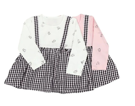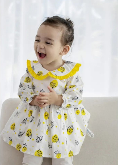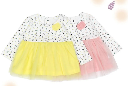 迷你童装连衣裙,有粉红/粉黄两种可爱颜色,满赋春意的水果图案,赋予宝宝活力,嫩黄和粉红让人纯净可爱。