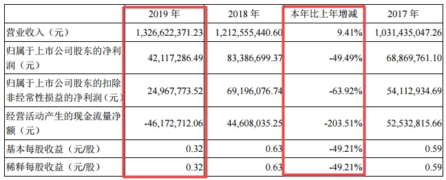 日前,童装品牌安奈儿发布了2019年年度报告。报告显示2019年全年实现营收13.27亿元,较2018年增长9.41%;归属上市公司股东的净利为0.42亿元,与2018年相比大幅下滑49.49%;归属上市公司股东的扣非净利润为0.25亿元,下滑63.92%。