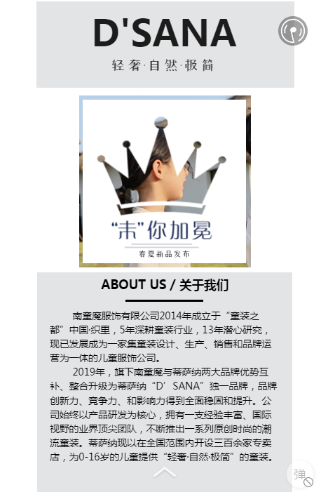 蒂萨纳D'sana童装从孩子的日常穿衣着手,通过优质的面料选用,到衣服的设计构想,为各年龄段的孩子推出一系列原创时尚的潮流童装。