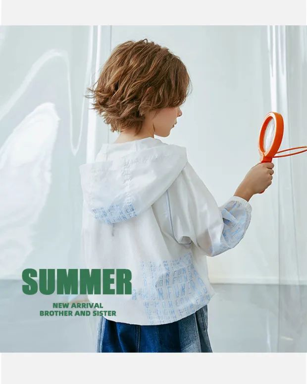 袖口、帽顶、衣边印有蓝色英语字母,时尚不单调