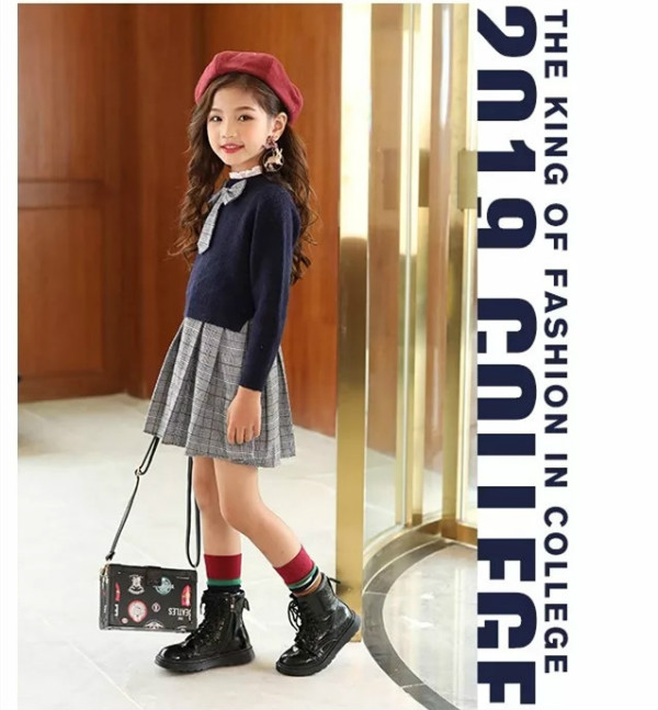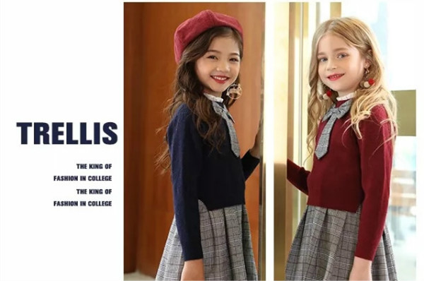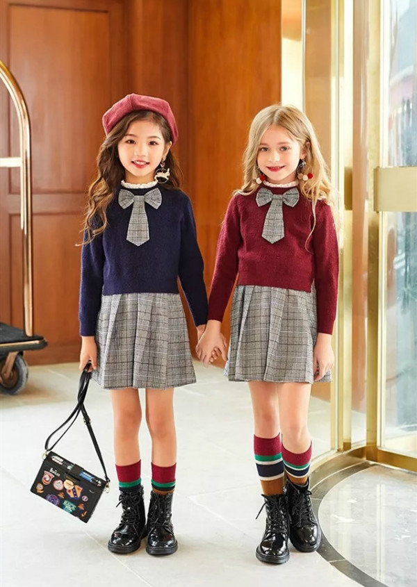 一款经典学院风套裙,毛衫加入闪亮的彩葱线,阳光下展现出若隐若现的光泽,威尔士亲王格纹的蝴蝶结和裙身,很好地诠释复古时髦,整套搭配低调奢华。