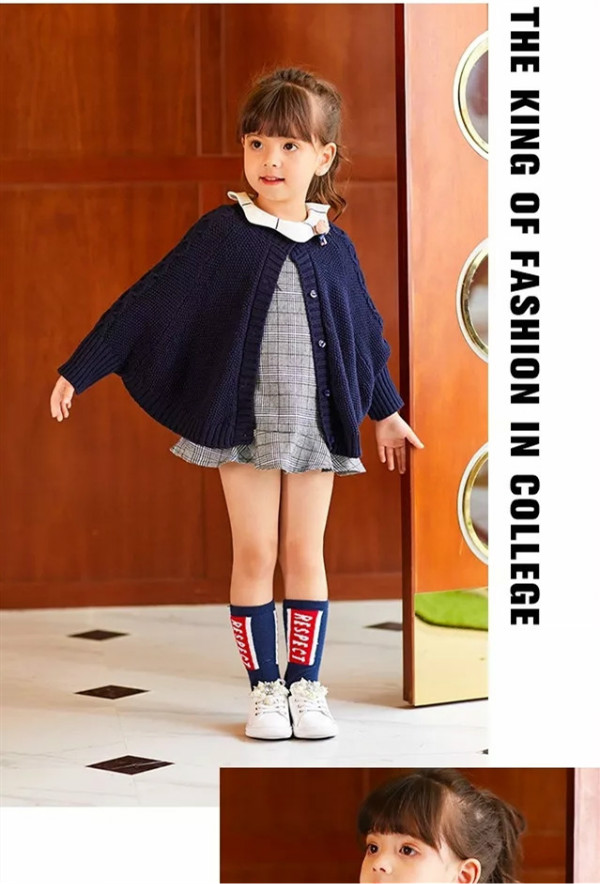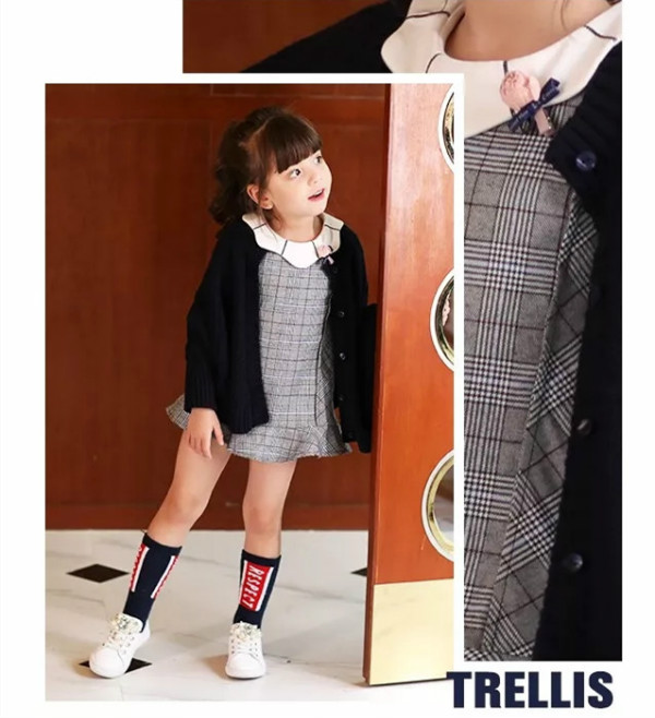 一款全棉毛织外套,与俏皮的格纹连衣裙相搭,内搭娃娃领,小白鞋,整体俏皮不失时尚。
