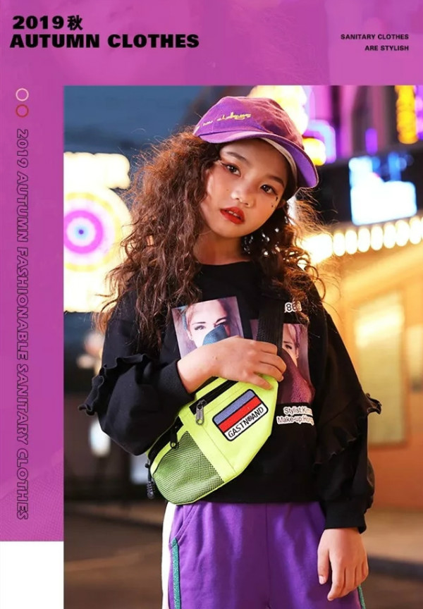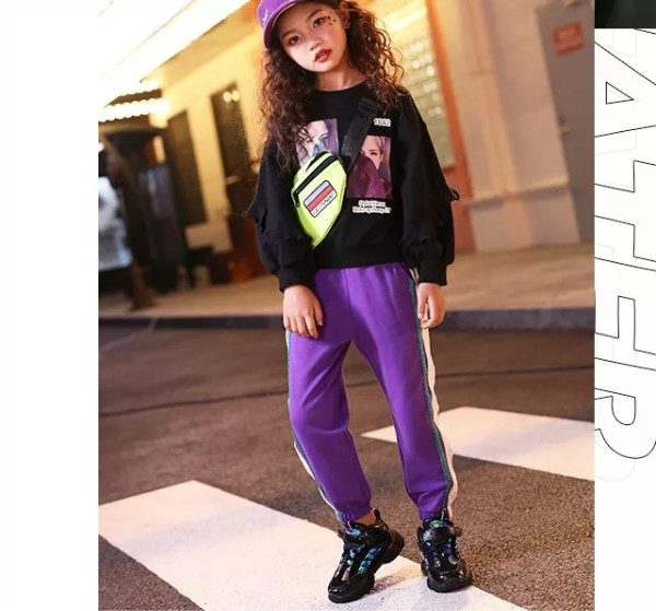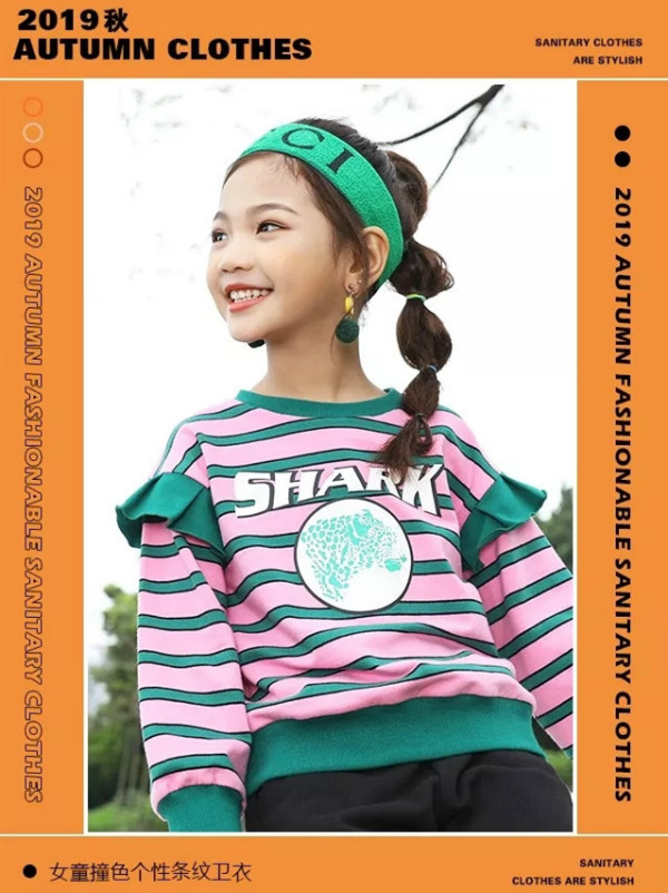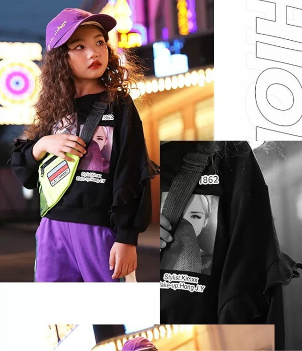 一款融合荷叶边与条纹元素的卫衣,用动物结合英文字母图案装饰,提升时尚度。搭配运动裤装,尽显潇洒与酷酷的女孩感。