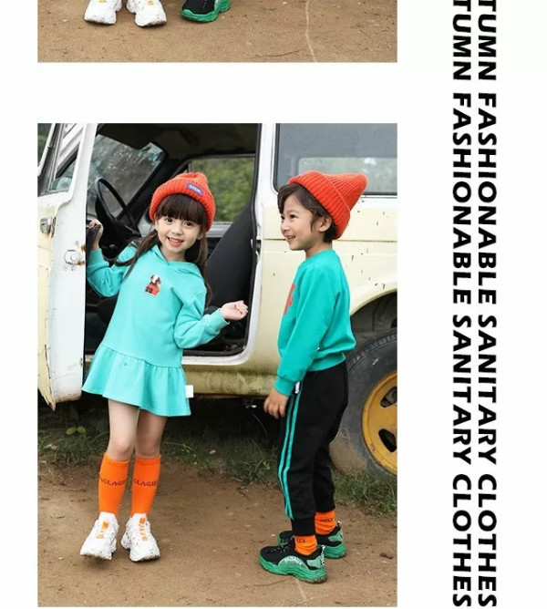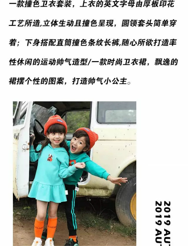 一款撞色卫衣套装,上衣的英文字母由厚板印花工艺所造,立体生动且撞色呈现,圆领套头简单穿着,下身搭配直筒撞色条纹长裤,随心所欲打造率性休闲的运动帅气造型。一款时尚卫衣裙,飘逸的裙摆个性的图案,打造帅气小公主。