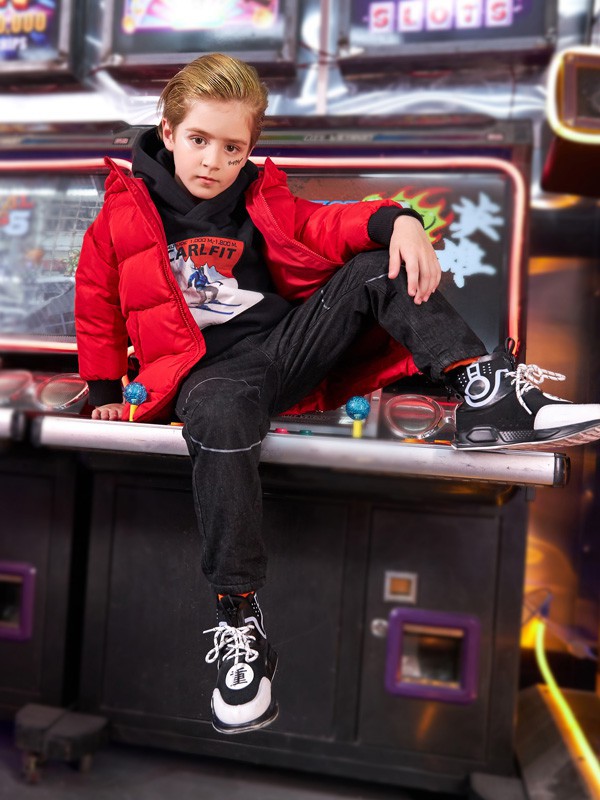 大红色的颜色看起来是不是很喜庆,有的家长会觉得红色不是很适合男孩穿,但是这款外套为你诠释什么叫做帅气,版型是稍微长一点的款式男孩子穿在身上有一张种“玉树临风”的感觉,内搭一件黑色卫衣,卫衣可是在冬季最常见的时尚单品了, 同时不需要费心的搭配穿在身上就很帅气,搭配一件黑色裤子,一双运动鞋的搭配很是帅气哦。
