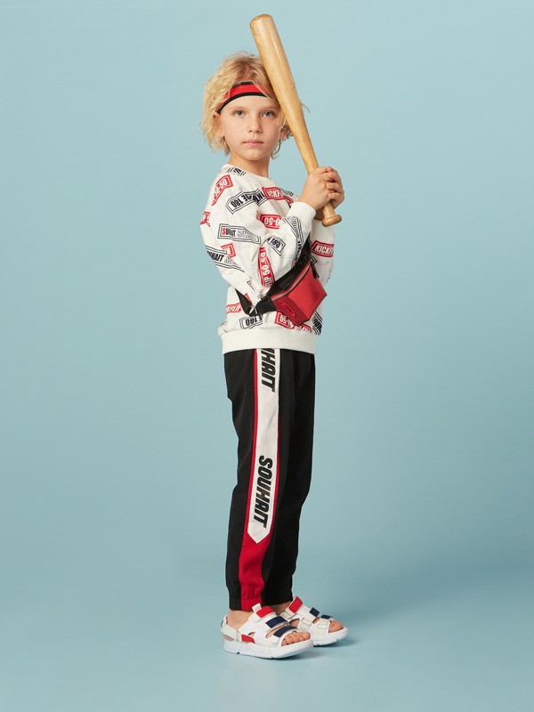 这款搭配很是好看,圆领的设计修饰脖颈曲线,将孩子的脸型修饰的也很好看,卫衣上英文字母的设计使这款卫衣看起来很是时髦帅气,版型是很合身的,将孩子的身形勾勒出来,这样的卫衣你能错过么,下身搭配一件黑色运动裤,英文字母的设计很是帅气,搭配一双运动鞋,整体的造型帅气又很休闲。