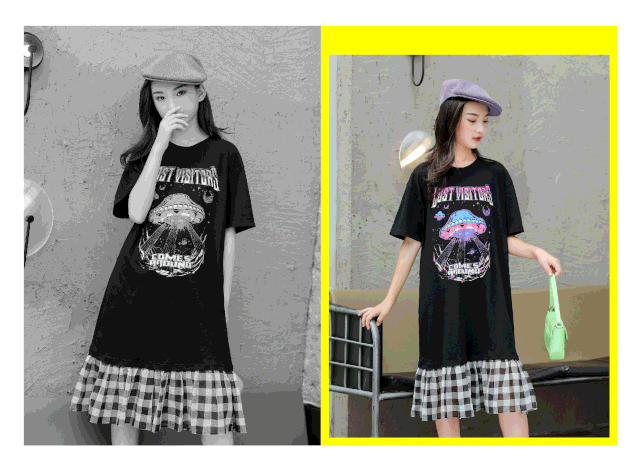 舒适棉质长裙,拼撞雪纺格子下摆,科幻加英文字母印花图案的结合,宽松的版型穿着舒适,时尚且大方。