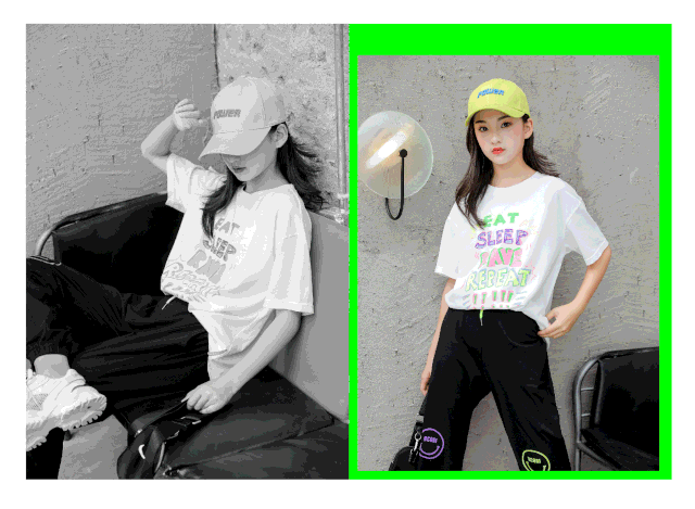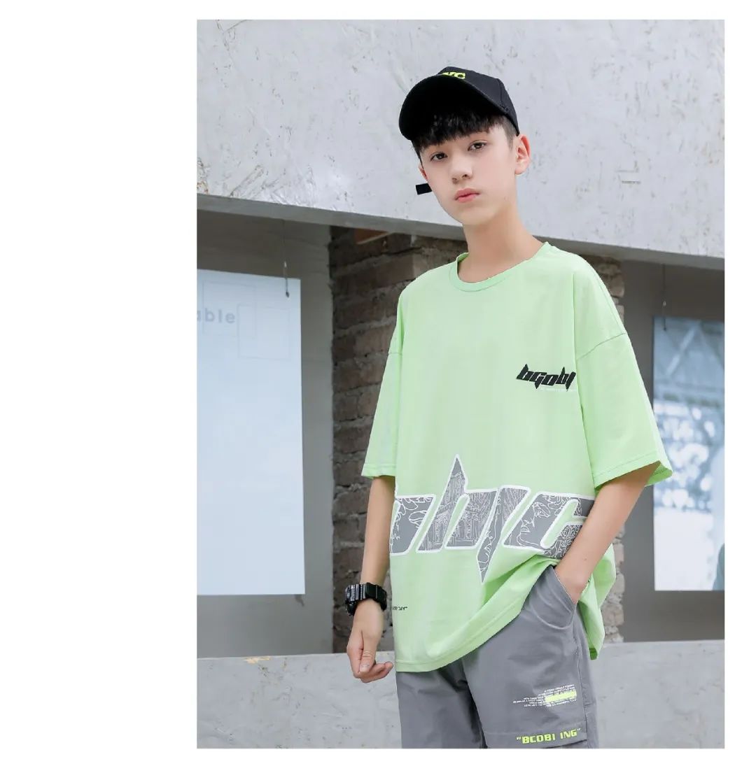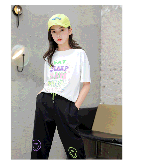 小圆领T恤,轻薄舒适,色彩丰富的印花图案,时尚简约。纯棉九分裤,不对称颜色印花加撞色的腰绳,休闲百搭。