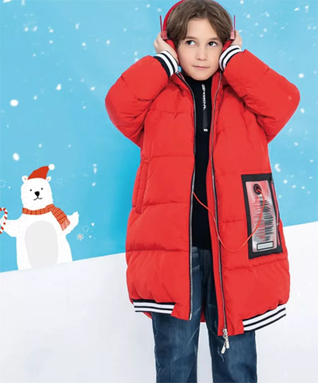 多功能羽绒服,黑色,大红款。便携式耳机穿孔大口袋,内嵌入体温计,孩子温度随时关注,外面则可以测试天气温度,功能强大又保暖。