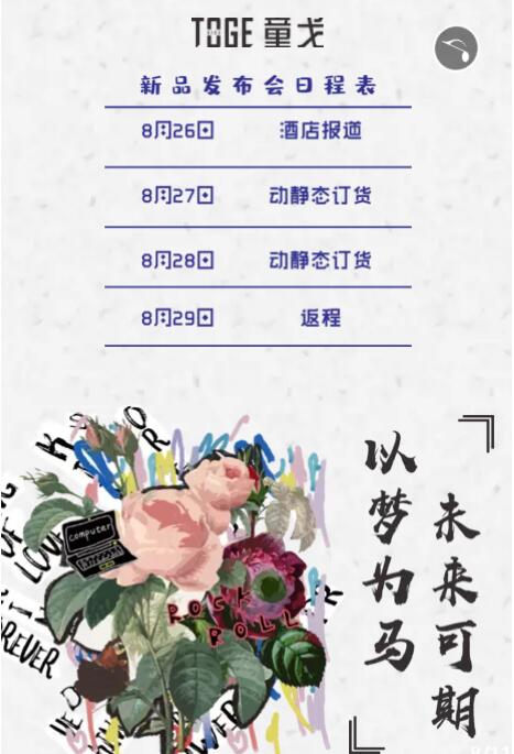 现在拼搏留下的汗水,一切都是为了把未来变成我们想要的样子。实现梦想的路上,我们并不孤单,童戈&童戈贝贝《以梦为马·未来可期》8月26日—29日诚邀您与我们一起同行。这次春夏新品发布会,会让你在***时间感受到童装潮流的变化以及童装市场的发展情况,让你在时尚的盛宴中,感受到童戈服饰有限公司的实力与能力,同时也让你能够抓住机遇,抓住商机!