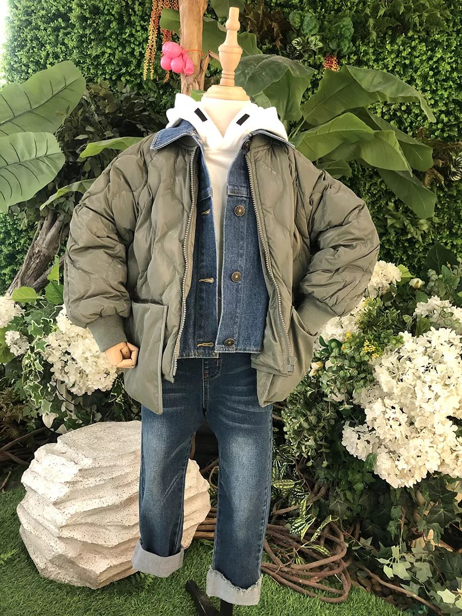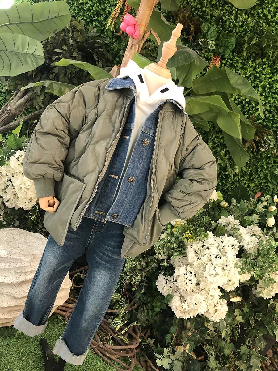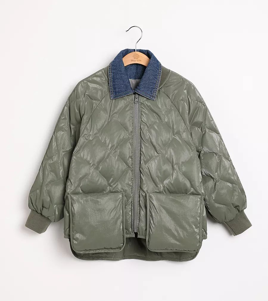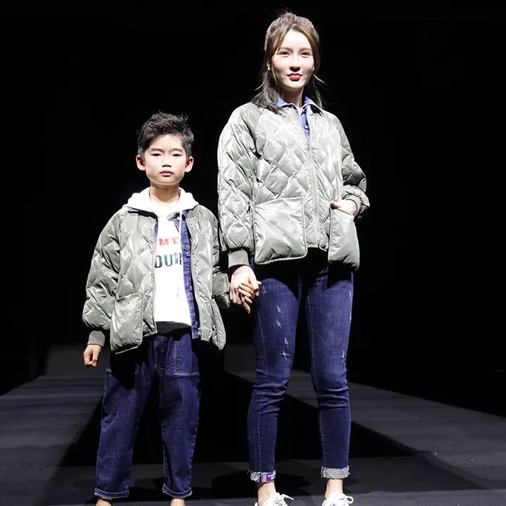 如果你想要整体风格比较休闲的,小贝推荐这件亲子装羽绒服,青草绿非常有大牌质感,牛仔面料的拼接充满街头风,随意搭配都是一种轻松惬意的亲子闲暇时光。