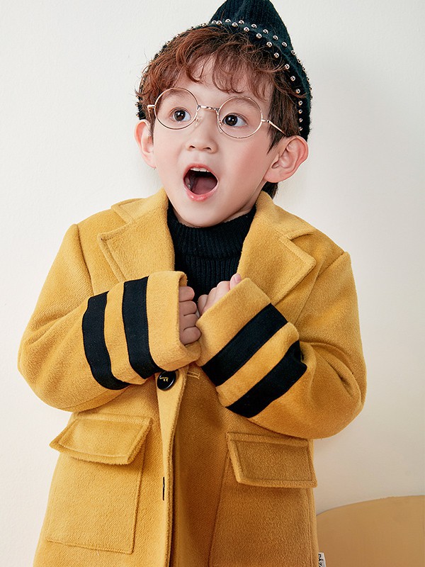 棣仔童装姜黄色呢子外套款式搭配,内搭一件黑色打底衫效果即可,黑色经典又百搭的颜色,黑色打底衫配上亮色的外套或者深色系的外套效果都很不错哦,10几度的温度适合配上打底衫配上呢子外套。