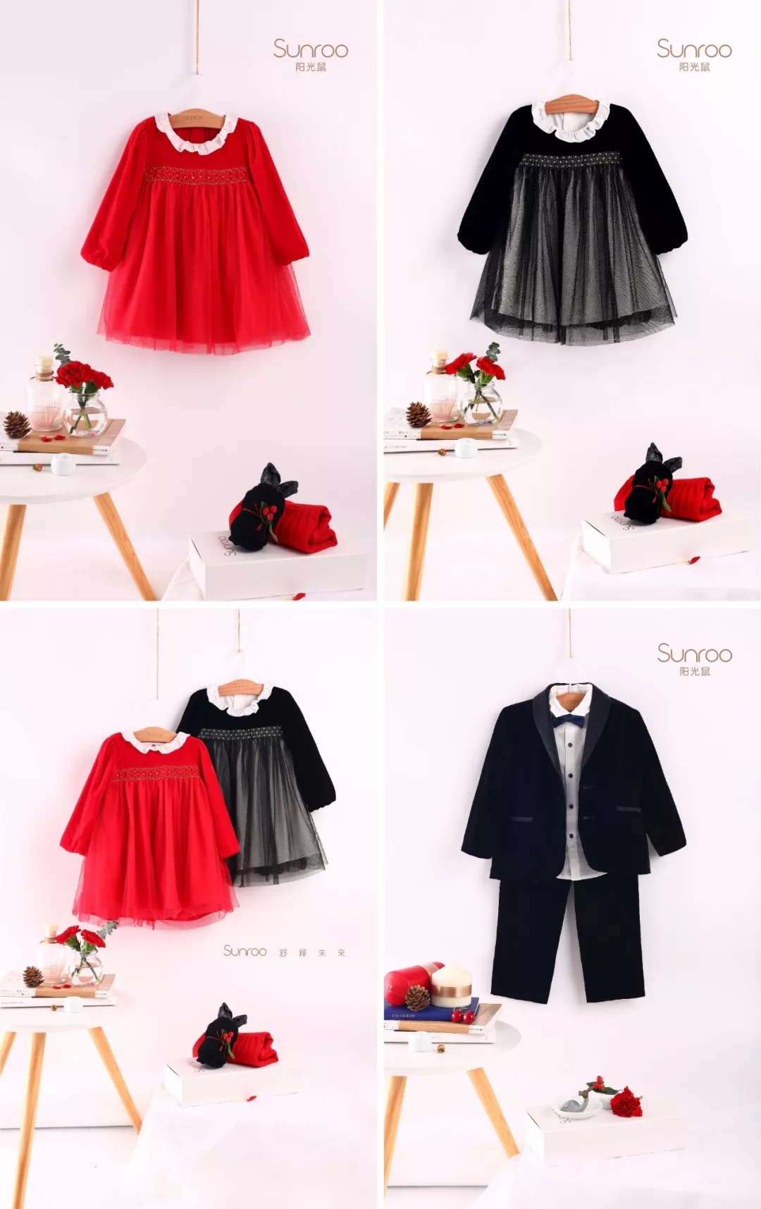 Sunroo2019节日礼赞系列,甄选高品质丝绒与精致网纱,通过合体剪裁与精美设计,带孩子感知成长的仪式感,喜悦满满地迎接新的一年。