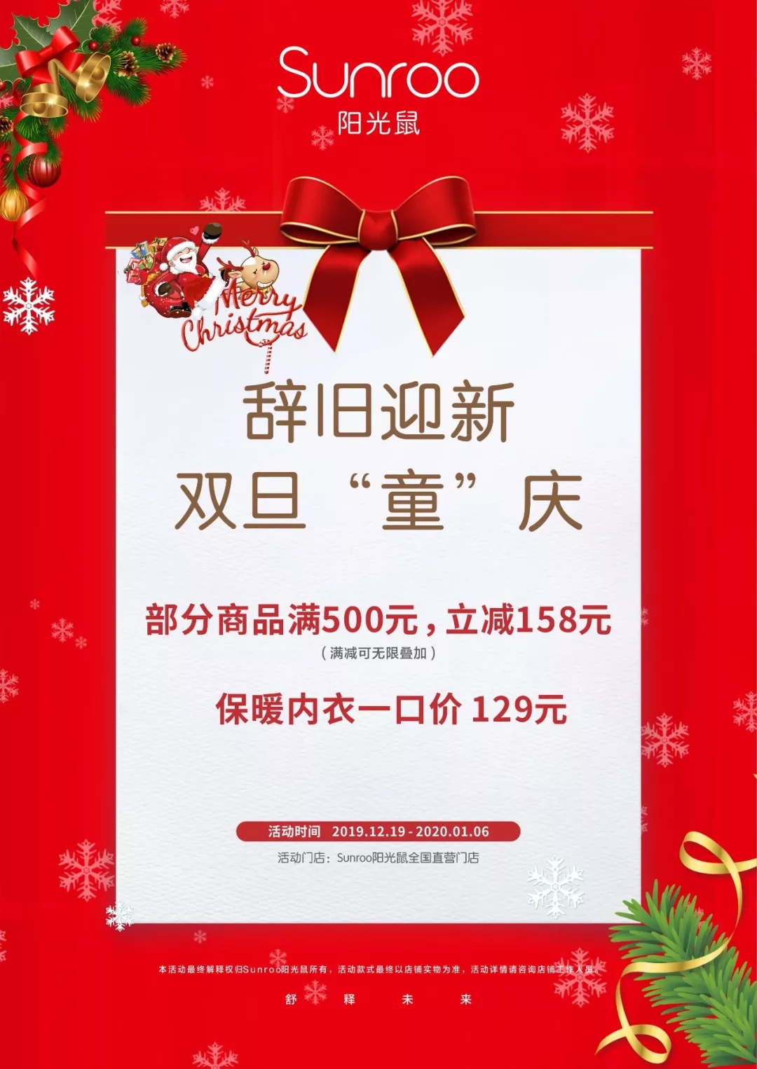 圣诞、元旦即将来临Sunroo阳光鼠全国直营门店感恩回馈,臻情献礼一年一度大满减红包福利比双11、双12更超值哦!