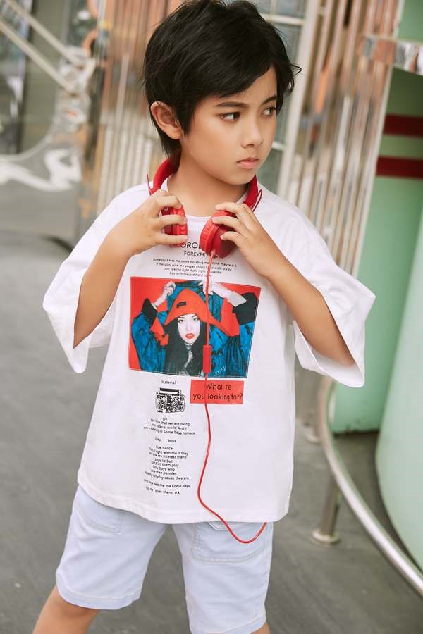 简洁干净的白色T恤,让小朋友看起来分外的乖巧,胸前的印花图案增添了穿着的风味。下半身搭配牛仔短裤,率性百搭的造型不管在什么场合都能吸睛满满!