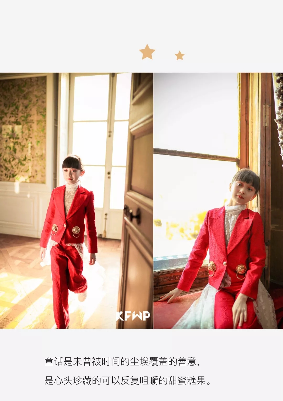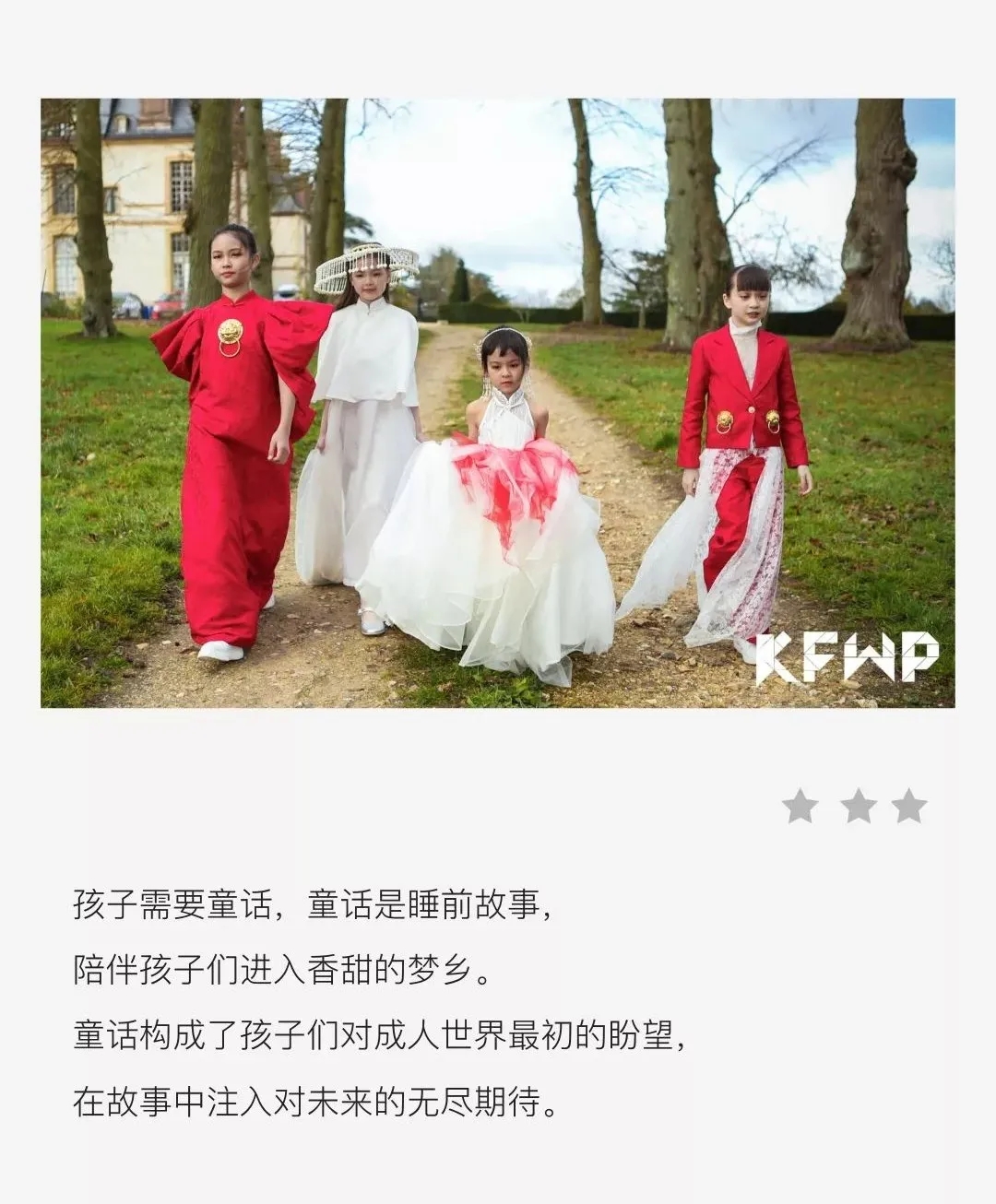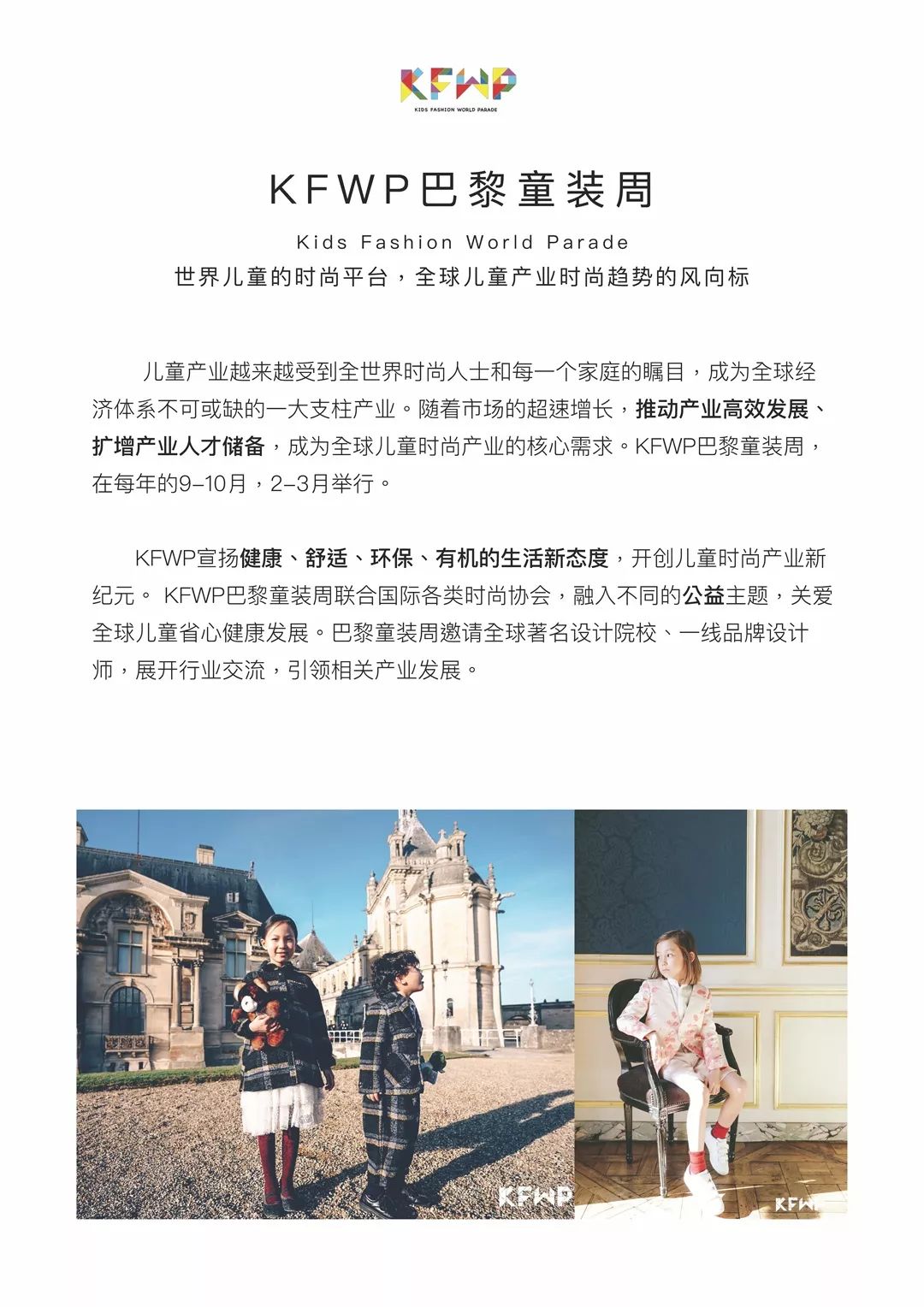 2020年1月19日,在拥有800年历史的巴黎Chateau De Thoiry古堡中KFWP巴黎童装周(Kids Fashion World Parade in Paris) 如约而至。KFWP用童话风格的时尚语言,敲开中法儿童时尚交流的一扇门,带给孩子们更好的时尚体验。