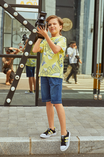 白色的T恤是必备的,那亮色系更是春天不可缺少的单品。巴柯拉2020春夏款黄色涂鸦短袖T恤,非常时尚,而且很有活力哦。搭配一条男孩子喜爱的牛仔短裤,帅气的很!